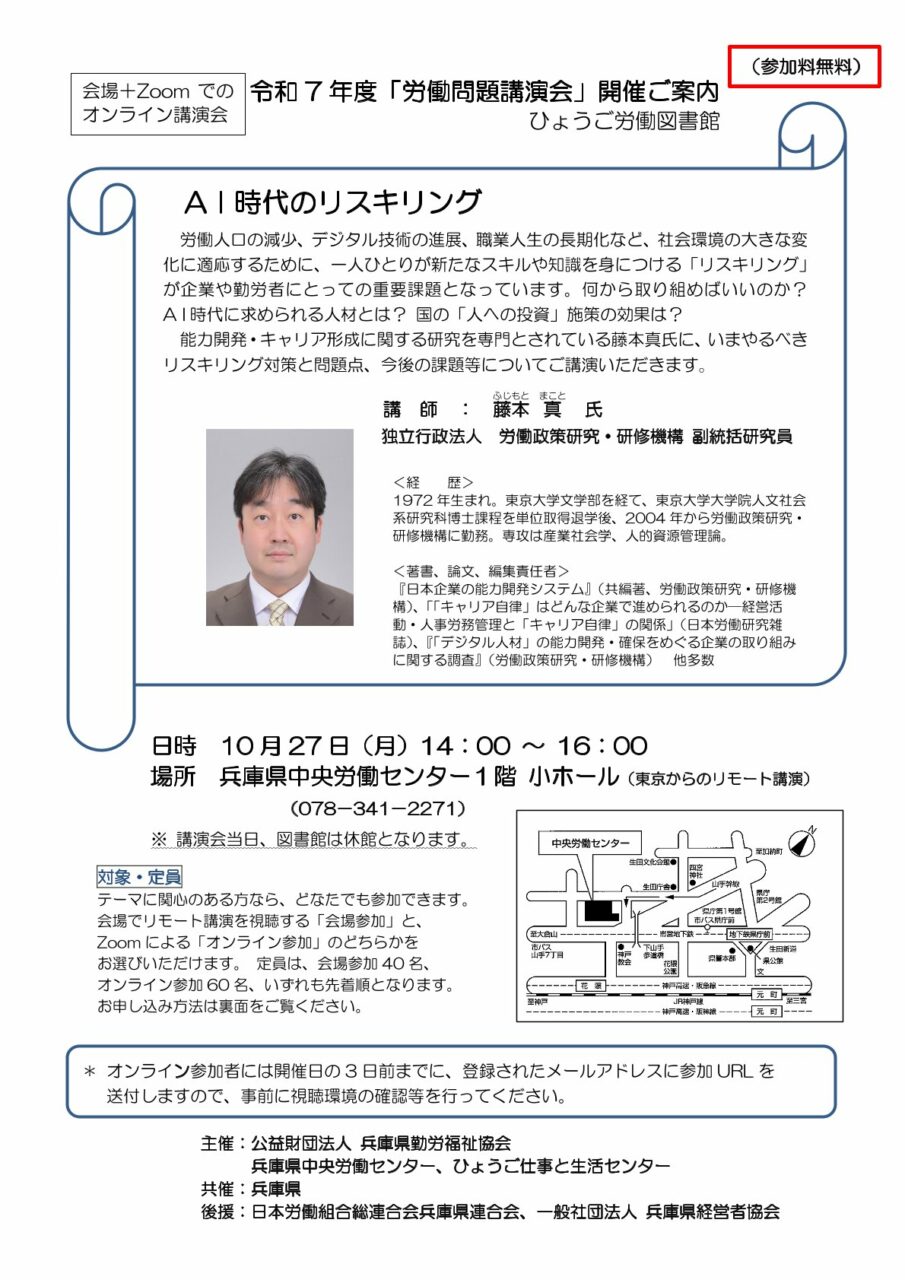 兵庫県中央労働センター 1階 小ホール にて、開催予定です。 (東京からのリモート講演)