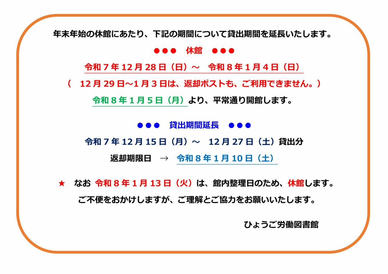 年末年始の休館日と貸出期間延長のお知らせ