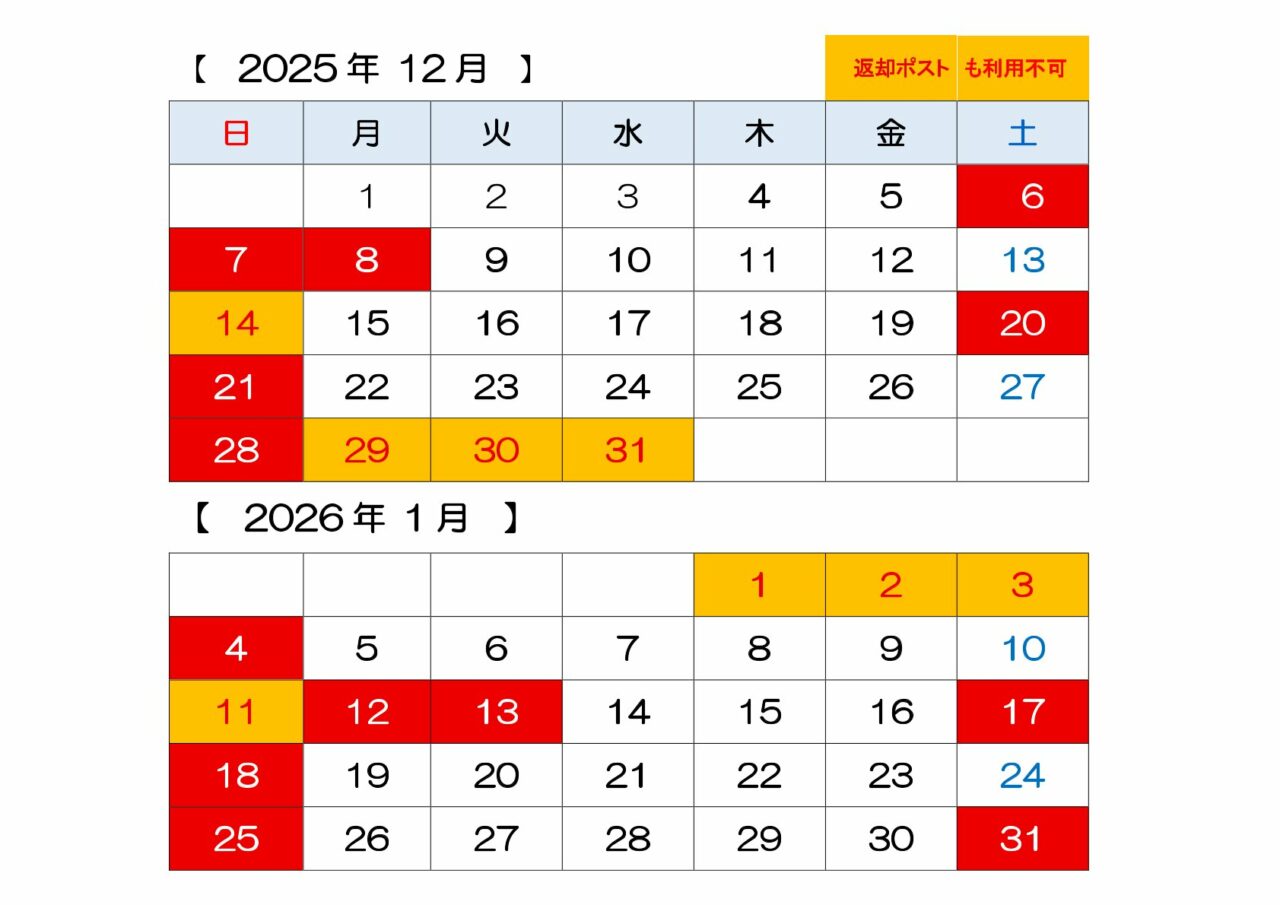 12月29日(月)~ 2026年 1月3日(土)は、返却ポストもご利用できませんので、ご注意ください。