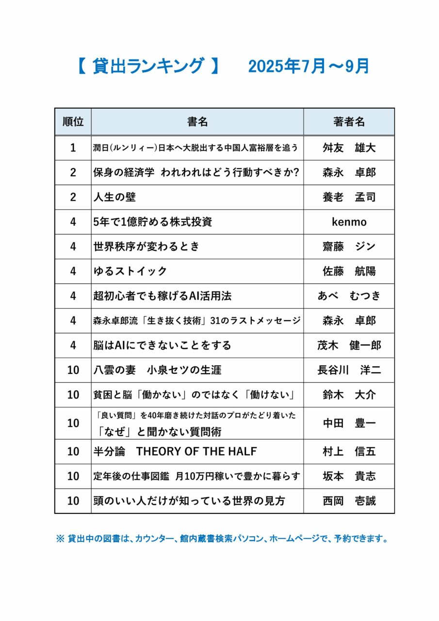2025年7~9月期の貸出図書ランキングを更新しました。