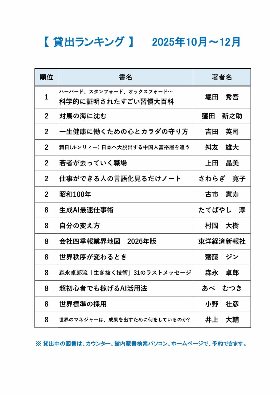2025年10~12月期の貸出図書ランキングを更新しました。