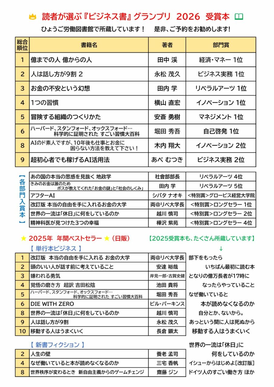 本年度は、2024年12月〜2025年11月に、日本国内で刊行された6分野(イノベーション部門、マネジメント部門、経済・マネー部門、自己啓発部門、リベラルアーツ部門、ビジネス実務部門)の書籍の中から、一般投票にて選出、2026年2月12日、受賞作品が発表されました。